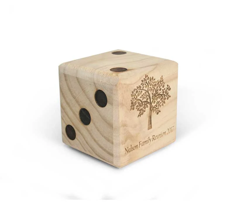 Get your giant wooden dice set customized with a laser engraved image or text of your choice. Custom made dice are perfect for promotional events, family reunions, weddings, and more!